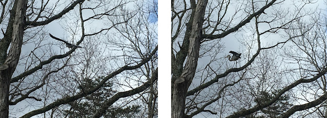 Do you see the blue heron down near the water, in the center of this photo? After fishing for awhile, he flew up into the tree in front of my office window.