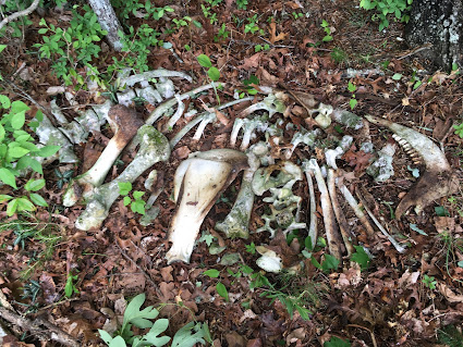 Then I noticed more bones and dug a few 'arm and leg' bones from their partial burial. At this point, after removing a layer of leaves from the area, I discovered this whole skeleton.