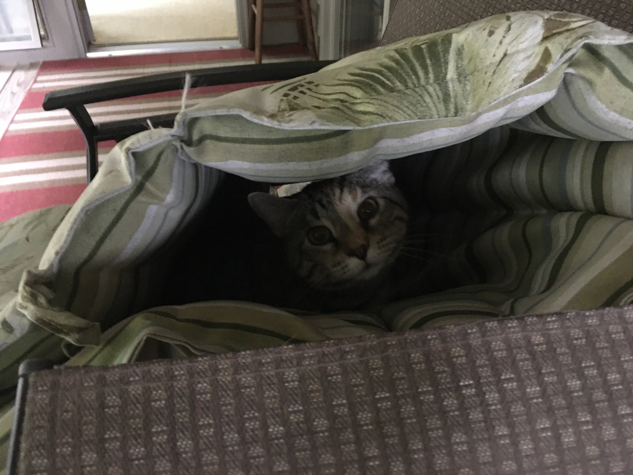 I was supposed to work in the afternoon but they ended up closing the pool for the day. I got the call to not report to work sometime mid morning. I don’t know what happened to the day, it just kind of slipped away. I did spend some time out on the porch. This is Monita hiding in a lounge chair cushion.