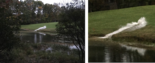 I was home by 4:30 to make a big salad for dinner. This got my fur babies riled up to eat, so I fed all of them just before sitting down to eat. Below is a photo of the broken sprinkler system across the pond. I called to report it and soon guys were out to fix it.