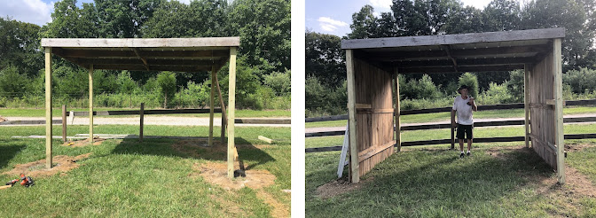 The first side of the shed was finished and Joe needed (had planned) to take a break and come back later in the day because it was too hot mid-day. (The record high for the day was 92° and I think we matched it.)