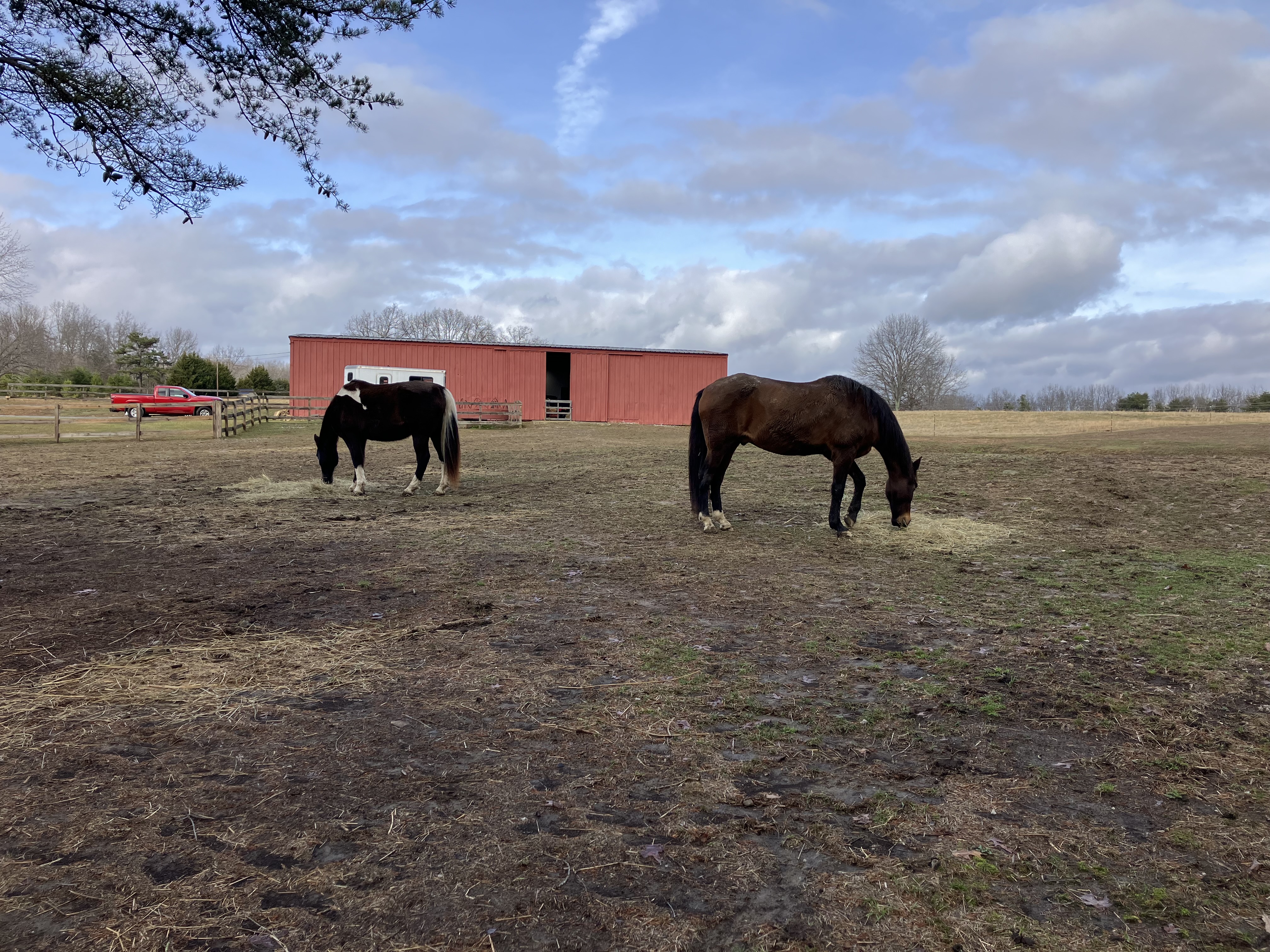 I got to the ranch at 10am and Patty had just gotten Banner and Amiga into their stalls. In order to distract Zorro and Cowboy, I put a few piles of hay out for them.