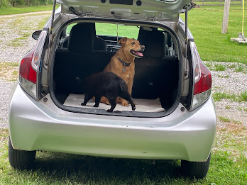 The back of my car was open because I had been unloading feed bags. Well when gunfire was heard in the not too far distance, Maggie hopped up in there, as if to say, 'let's go home.'